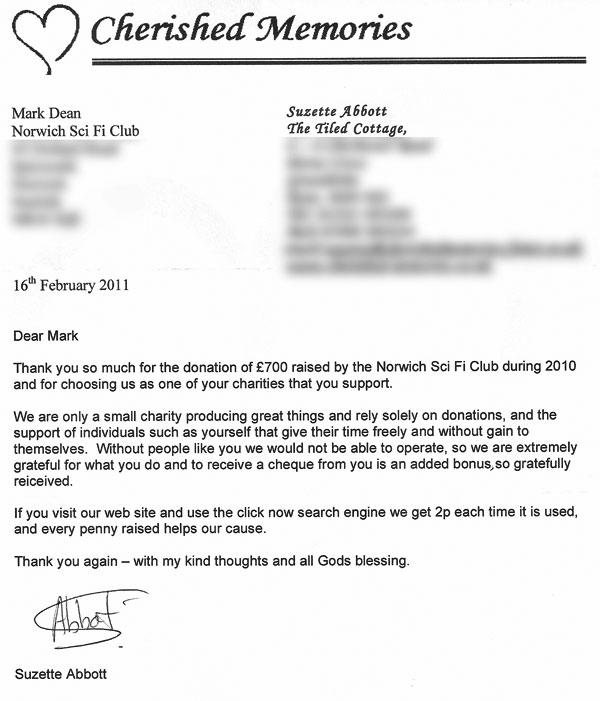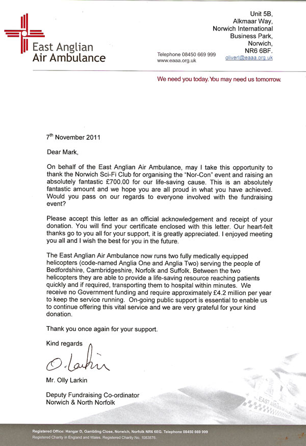| Cheque handed over to life saving services in East Anglia via NOR-CON 2011 |